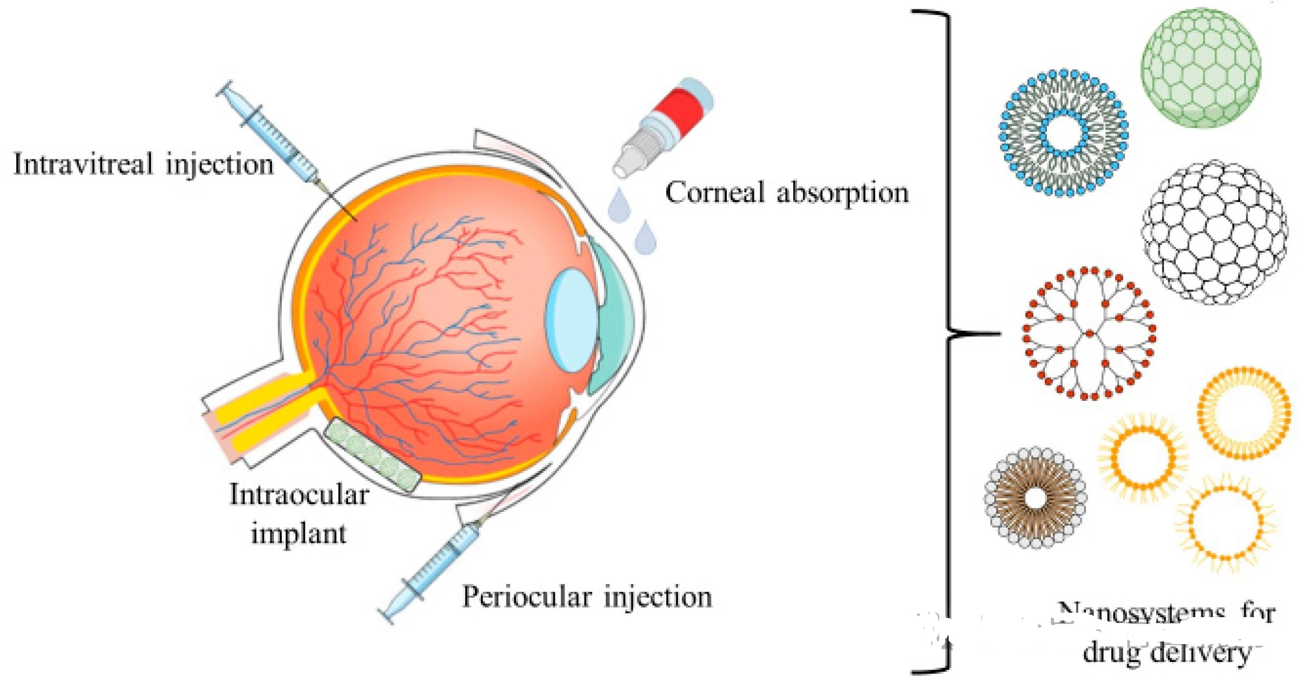 用于将 API 应用至眼后节组织的局部递送方法(使用上述任何方法来增强生物利用度和停留时间),将有助于增加这些 API 通过房水的玻璃体途径、葡萄膜/巩膜途径的转运通过施累姆氏管引流或通过结膜脉管系统的眼周路径。然而,达到所需眼后节组织的 API 水平受到许多生理障碍的严重限制。通常认为,直接玻璃体内递送是这些治疗的最有效的给药途径,尽管也有其缺点。现有大量研究报道了通过将 API 的配方优化为微米或纳米颗粒、乳液、脂质体或固体可降解或不可降解植入物来增强 API 控制和持续递送的方法。利用对 API/制剂与生物环境相互作用的材料科学的理解来优化向所需组织的治疗递送,还有广泛的开发前景。