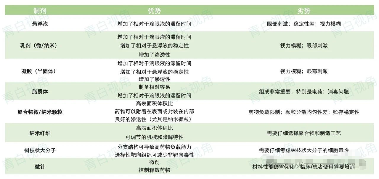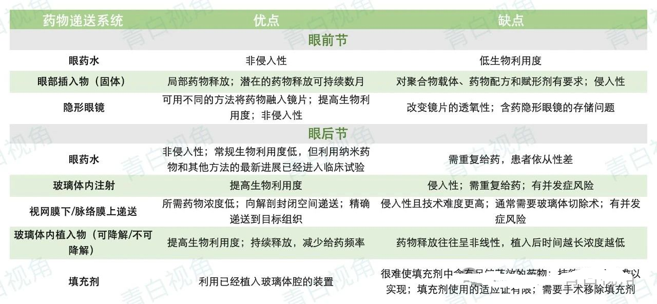 为了使 API 更有效地分布到眼前节组织中,目标是增强组织对 API 的渗透性并延长 API 与这些组织的接触时间;在实现这一目标方面,局部制剂已经取得了重大进展。在眼后节组织中实现治疗水平的 API 的最有效方法是将其直接注入眼后节。但频繁注射到眼后节有很多缺点,因此目标是通过每次注射提供受控和持续缓释的API水平。可以利用对已用于眼部的合成材料或具有合适特性的新材料的材料科学的理解,来开发缓释药物递送系统以增强治疗效果。但适当的解决方案将取决于 API、目标组织和所需的治疗方案,详细见以下表1,表2。
