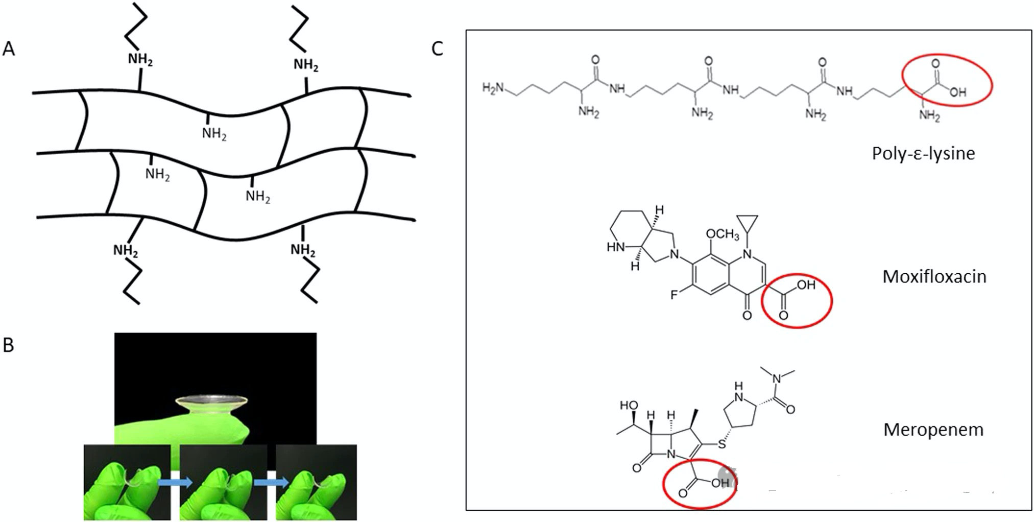 图1:ε-聚赖氨酸绷带镜。A. 水凝胶结构示意图,显示潜在的API结合位点;B. 展示隐形眼镜制柔韧性;C. 可以通过羧基团结合的潜在API。