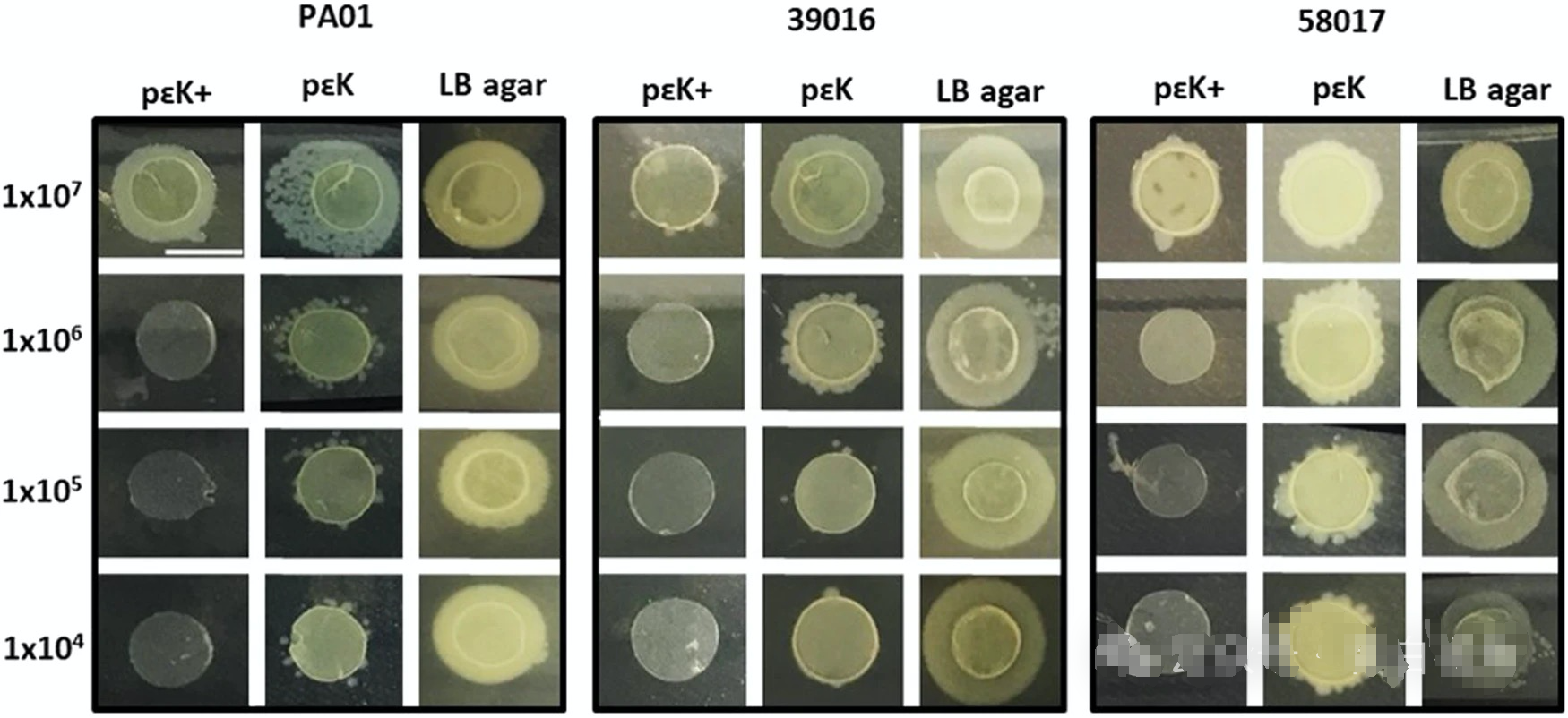 图2:带侧链ε-聚赖氨酸的聚赖氨酸水凝胶(pεK+)、ε-聚赖氨酸水凝胶(pεK)和LB琼脂圆片对铜绿假单胞菌生长的抑制效果。