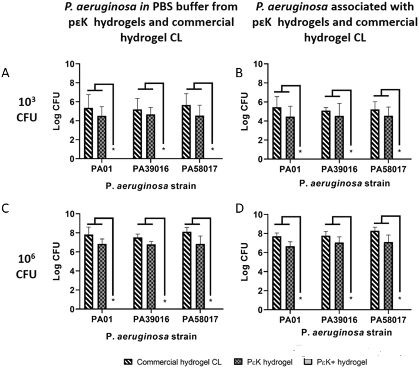 图3:带侧链ε-聚赖氨酸 (pɛK+) 的ε-聚赖氨酸水凝胶与ε-聚赖氨酸 (pεK) 水凝胶和商业水凝胶 CL 对铜绿假单胞菌分离株的抗菌活性进行比较。与 pεK 水凝胶和商业水凝胶 CL 相比, PBS 缓冲液中的存活铜绿假单胞菌( A、C ) 以及与 pεK+ 水凝胶相关的活铜绿假单胞菌 ( B、D )。将 PεK+ 水凝胶、pεK 水凝胶和商业水凝胶 CL 以 10 3 ( A , B ) 和 10 6 ( C , D ) CFU接种铜绿假单胞菌(PAO1、PA39016 和 PA58017)24 小时。