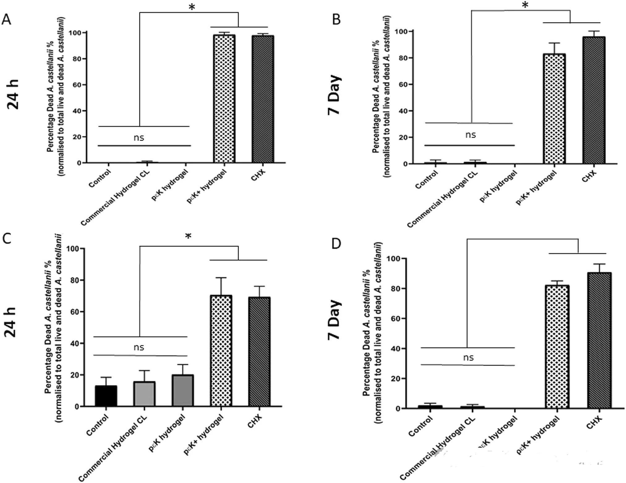 图4:与ε-聚赖氨酸 (pεK) 水凝胶和商业水凝胶 CL 相比,带侧链ε-聚赖氨酸的ε-聚赖氨酸水凝胶对卡氏棘阿米巴的毒性。图表显示 24 小时死亡滋养体的百分比;B图显示7天时死亡滋养体占存活和死亡滋养体总数的百分比;C图显示24小时时死亡包囊的百分比;D图显示7天时死亡包囊占活和死滋养体总数的百分比;氯己定是阳性对照。实验一式三份进行(n = 3),每个实验三个孔,每个孔有五个视野。