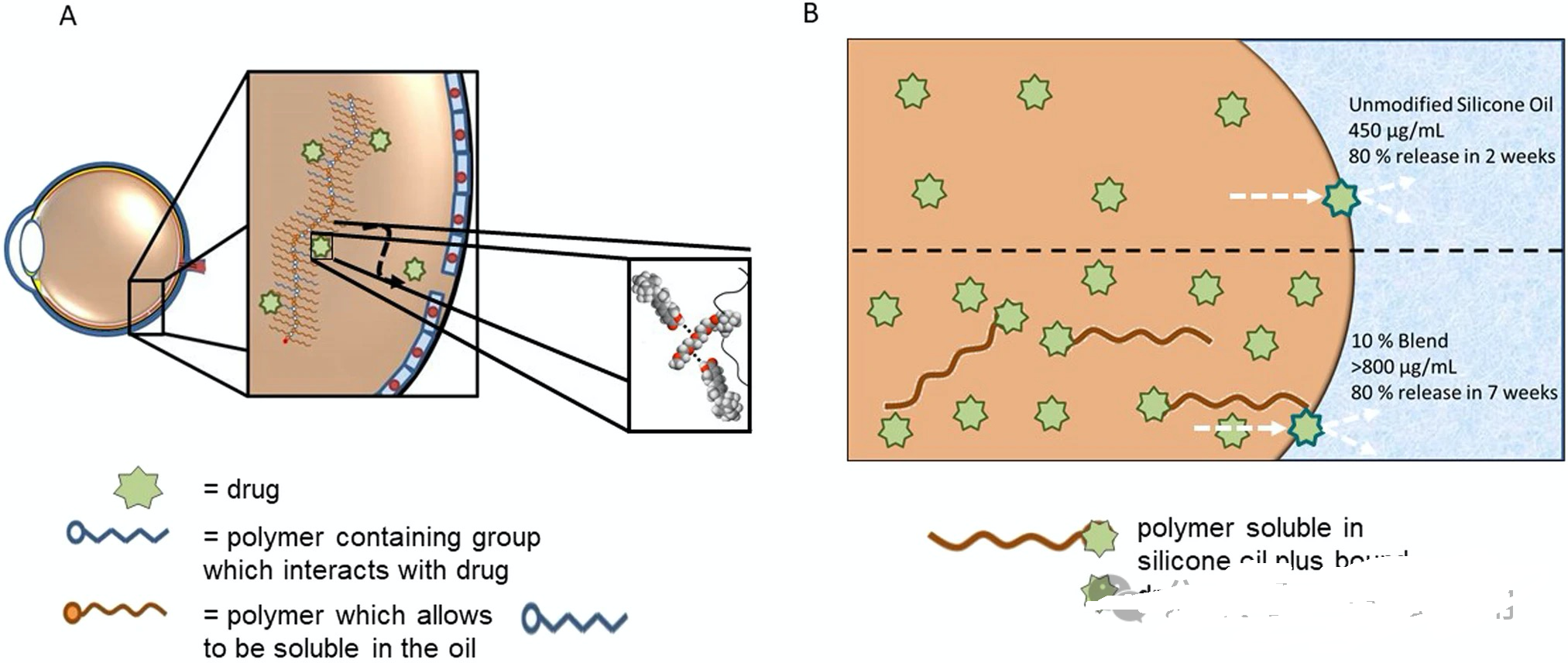 增生性玻璃体视网膜病变(PVR)是视网膜脱离的主要并发症之一。研究人员评估了硅油填充物递送亲水性或疏水性抗增生API的潜力。然而,由于硅油中的API溶解度差,导致API负载量低、无效及释放不受控制,这可能会导致毒性问题。为了解决这一问题,研究人员采取了两种不同的方法:一种是设计短链共聚物,另一种是设计可溶于硅油的聚二甲基硅氧烷-API缀合物。
