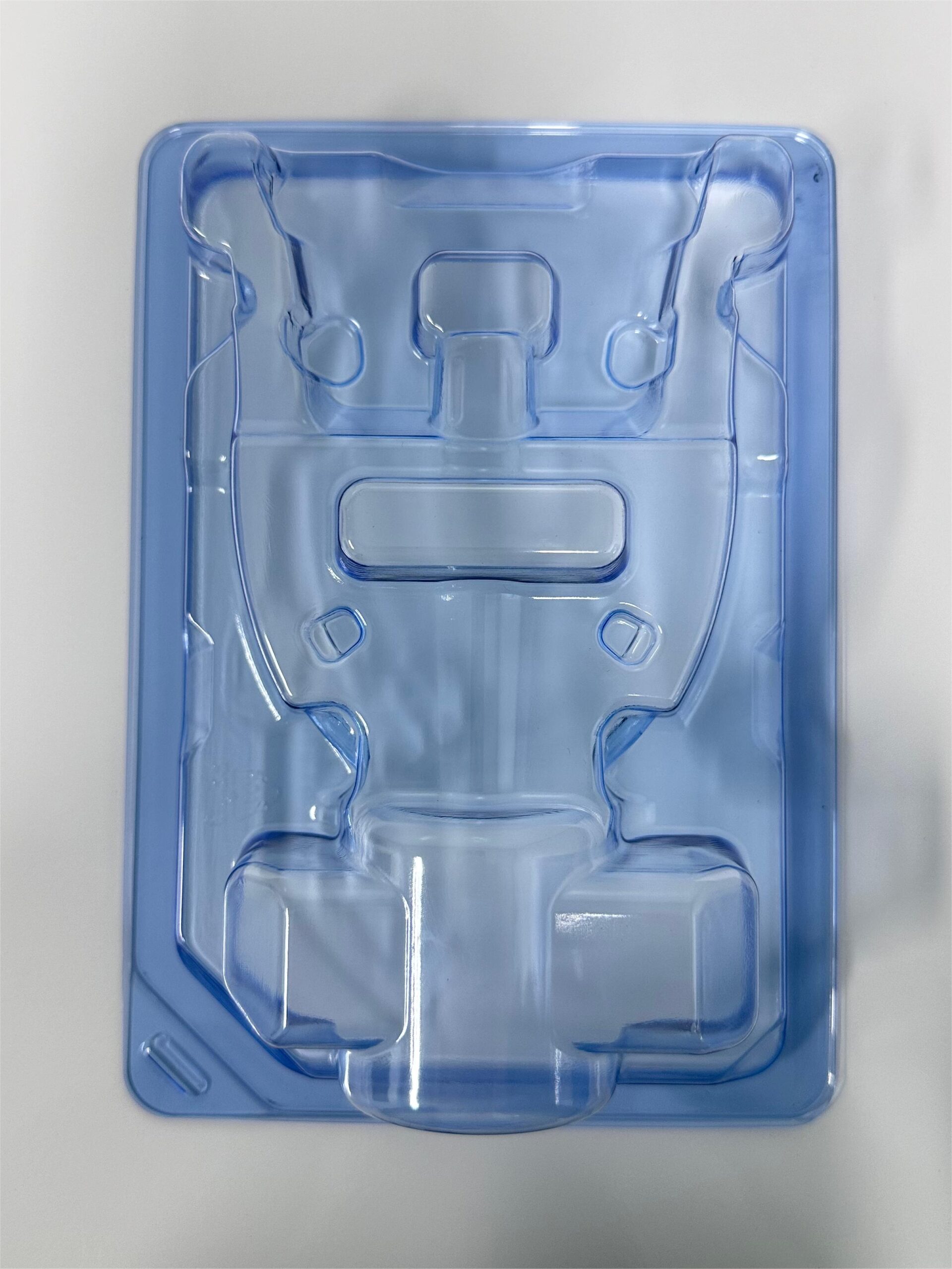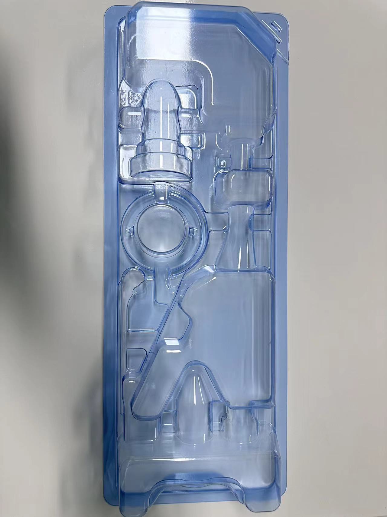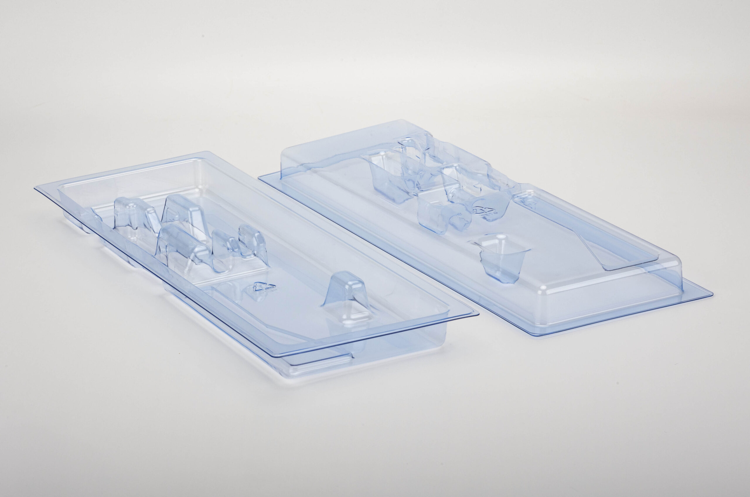 PETG是一种透明、非晶型共聚脂材料。对于三类医疗器械生产厂商,PETG硬吸塑盒包装是首选。在中国内地多为蓝底透明材料,适合于环氧乙烷(EO)灭菌方式。PETG有更好的粘合力,和特卫强各型号盖材纸可以完美贴合。公司选用的PETG,主要是美国伊士曼公司生产的6763和韩国SK公司生产的S2008,这两个都是医疗级的原料型号,专为医疗包装开发,目前在行业知名度最高。具备完整的包装验证资料。满足医疗包装环保的要求;具备卓越的冲击强度,坚韧性非常好;优异耐候性,不容易黄变;优异的耐化学性能;充分满足其加工性能和终端应用(卡扣固定和洁净开启)。
