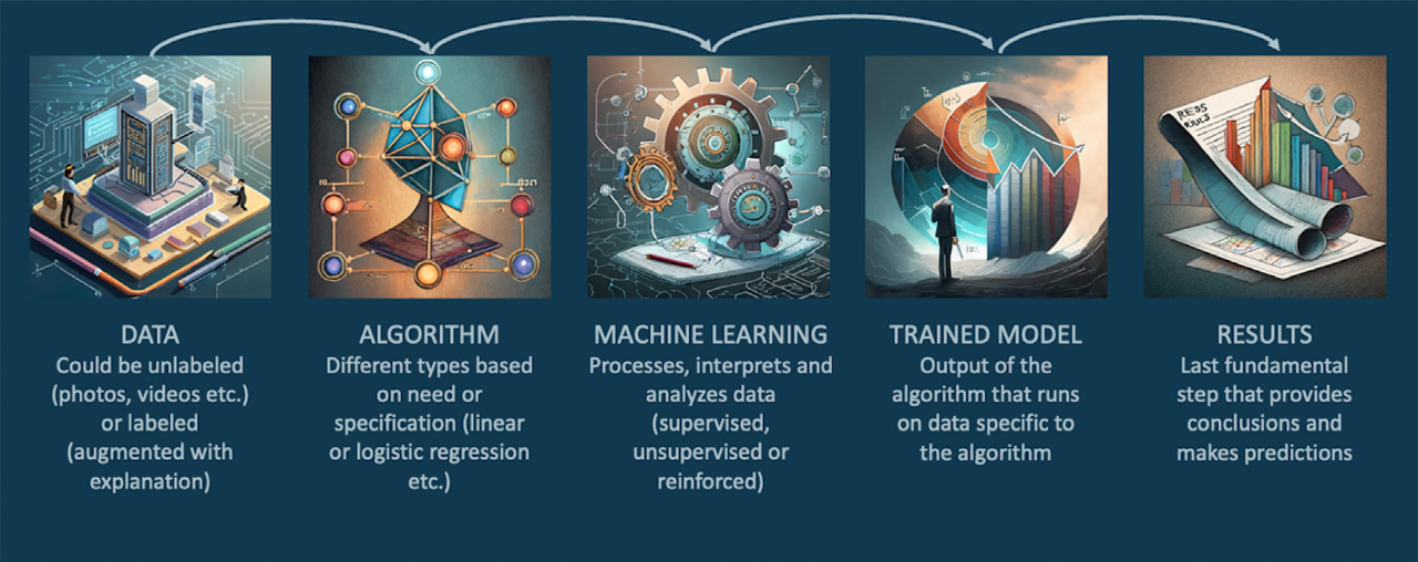 图2 人工智能系统的工作流。图片形象地表示了使用特定计算机算法处理的大量数据。然后由计算机进行分析,以提供基于算法的数学输出并形成结果。