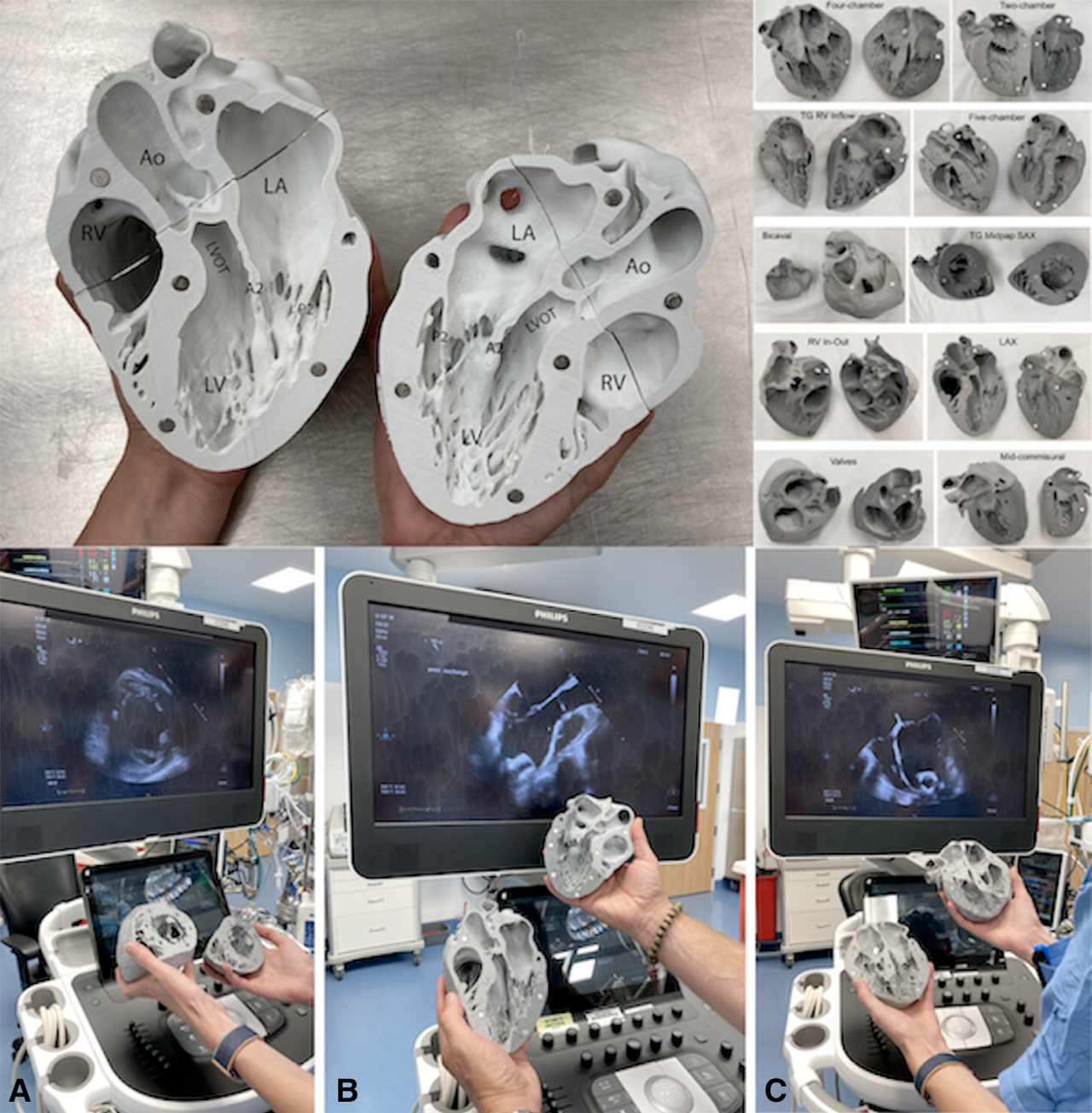 图4 上图展示了利用不适合移植的供体心脏制作的3D打印模型,以及相应的经食管超声心动图图像。下图展示了这些模型在手术室用于培训心血管外科住院医师和麻醉师的情景。3D,三维;RV,右心室;Ao,主动脉;LA,左心房;LVOT,左室流出道;LV,左心室。