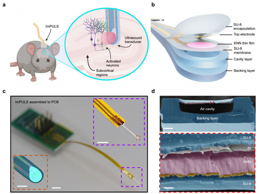 植入式压电超声刺激器(ImPULS)是一种柔性压电微机械超声换能器(pMUT),采用转印工艺利用耐用聚合物绝缘的生物相容性压电陶瓷制造,其中,SU-8作为基板、封装层和背衬层,KNN作为压电层,铬/金和铂分别用作顶部和底部电极,以及铬/金作为金属互连线。选择KNN作为无铅压电层的原因在于其较高的压电系数和耐用性,以及生物相容性、无毒性和商业可用性。最终的装置采用柔性ACF电缆和PCB板组装而成。