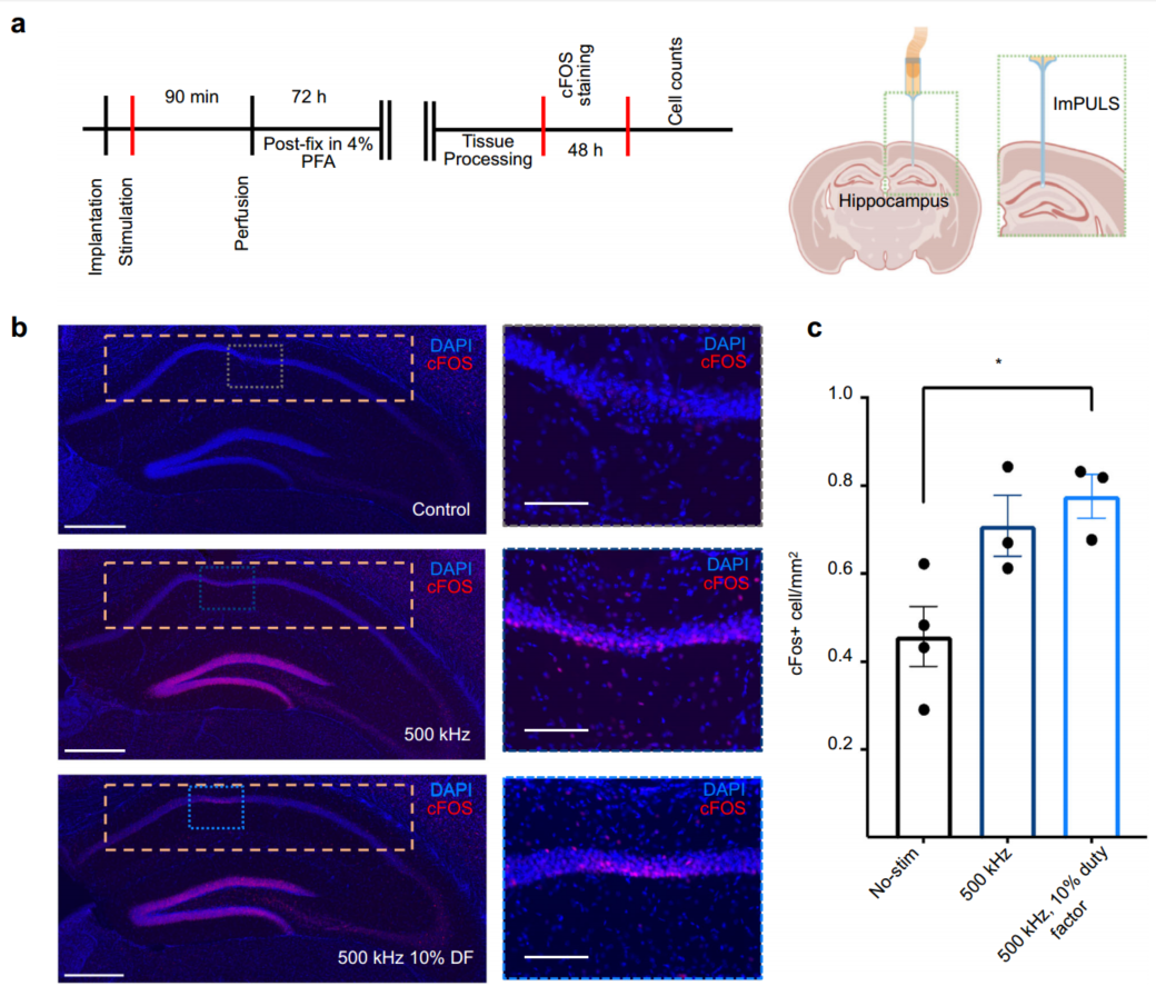 为了测试ImPULS在小鼠体内激活细胞群的效力,ImPULS被植入定位到小鼠的海马结构的背侧CA1 (dCA1) 层,并量化dCA1中cFos的相对水平。与无刺激(对照)组相比,所有刺激参数的结果中活动依赖性基因 cFos 的平均水平有所增加,这表明ImPULS足以激活小鼠海马 dCA1 层中的大量细胞。除此之外,结果还表明ImPULS刺激足以在慢性植入后引发神经元激活,说明ImPULS设备在更长期的时间尺度上具有功能可行性。