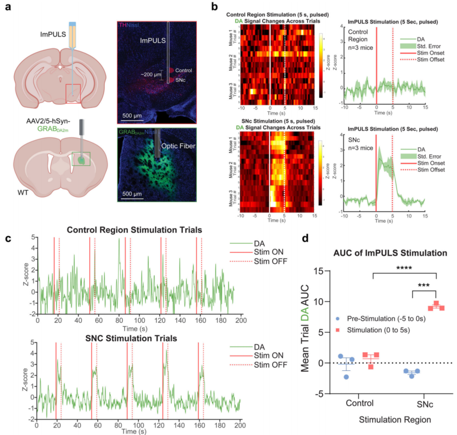为了测试ImPULS刺激对体内神经传递功能调节的效用,该研究尝试通过对黑质纹状体(SNc)进行 ImPULS 刺激来调节黑质纹状体多巴胺(DA)释放。结果表明,与刺激前基线相比,SNc刺激期间的DA AUC显著增加,此外,SNc刺激期间的DA AUC显著高于对照组刺激,而SNc和对照组刺激期间的基线AUC没有显著差异。综上所述,ImPULS以空间局部的方式引发黑质纹状体DA释放。在4只小鼠中,在相同参数下,mPULS介导的SNc刺激1.5s后,DA2m荧光平均分数增加,表明较短时间的刺激足以诱导DA释放。这些数据表明,空间定位的脑深部超声刺激能够调节体内的神经传递,甚至可以通过长距离投射。