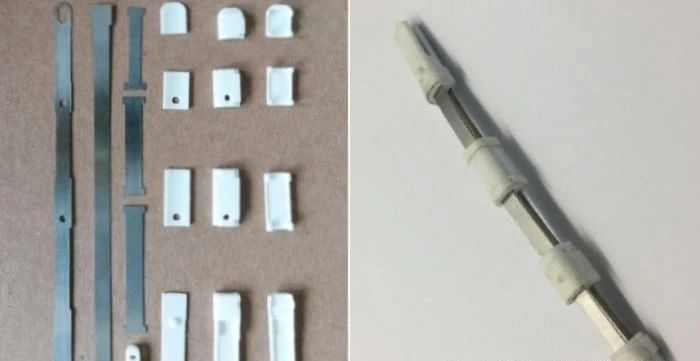 左边可以看到手指的各个组件,左边可以看到钢板弹簧,右边可以看到从 Iglidur I6(材料)打印的手指关节。右边是完全组装好的手指