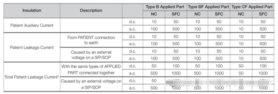 表1:根据IEC 60601-1的“辅助”和泄漏电流的允许水平