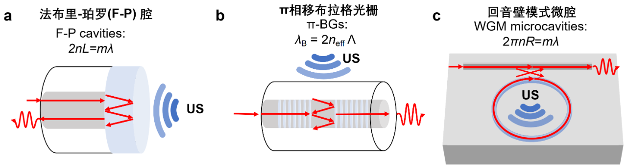 F-P腔,也称为F-P干涉仪或干涉腔,是最常用的光学微腔之一。它由两个平行反射面组成,通过光在两面反射镜之间来回反射从而将光子局域其中。F-P腔共振条件为:光在微腔中往返一次的光程等于光波长的整数倍,如图2(a)所示。由于其高品质因子和成熟的制造技术,F-P腔在激光器、通信、光学仪器、光谱学、天文学等领域被广泛应用。此外,F-P腔在超声波传感中也得到了重要应用。其检测原理为超声波改变F-P腔的腔长,使其光学共振频率移动,这种频移可以通过光学方法读出,从而实现超声波的检测。F-P腔结构较为简单,如果在F-P腔的一侧使用薄膜结构,则可以实现极高的灵敏度。位于光纤末端的F-P腔可以作为探针式超声波接收器,还可通过集成多个光纤实现阵列传感。然而,与其他光学微腔相比,F-P腔通常具有较大的体积,这限制了它的应用场景。