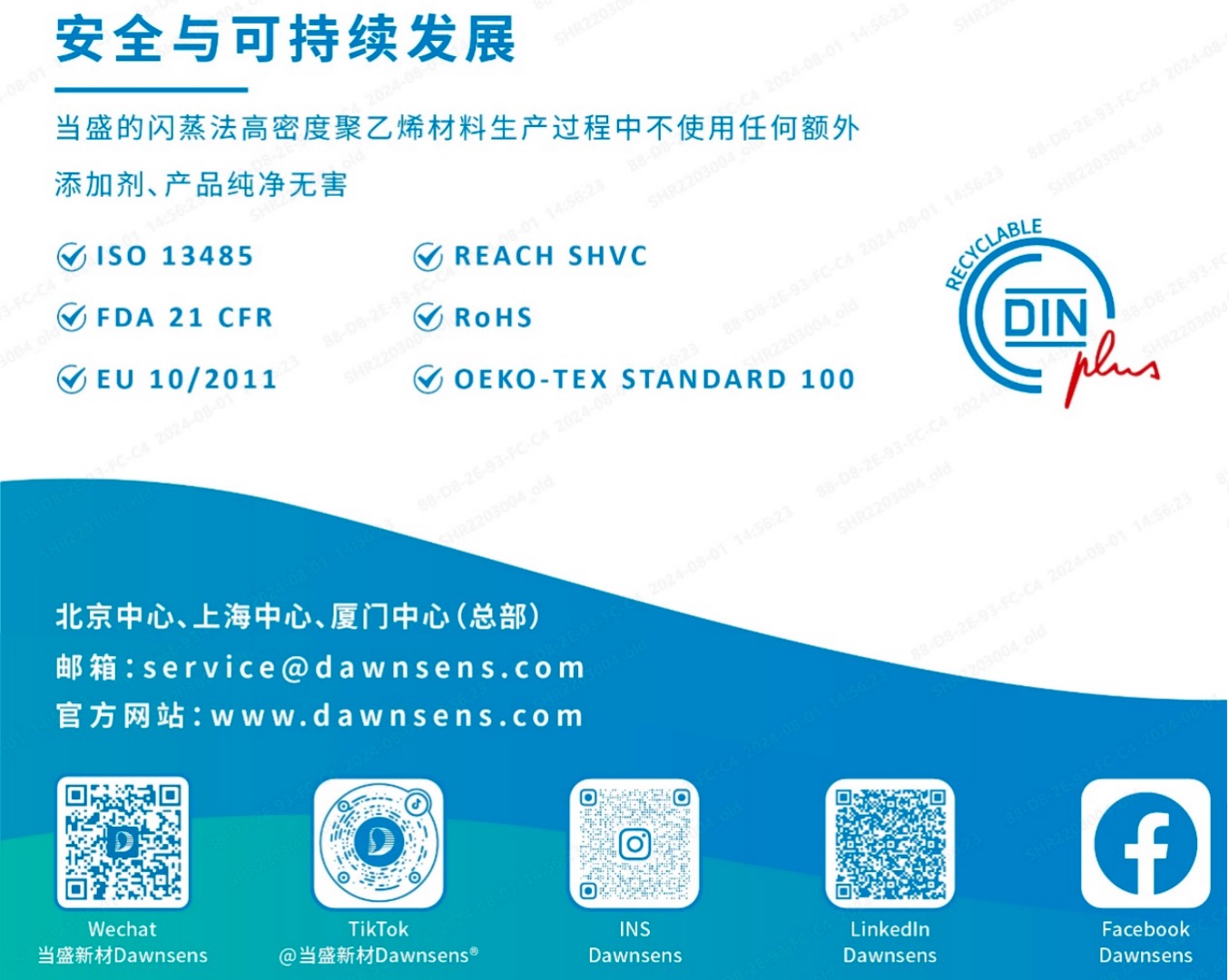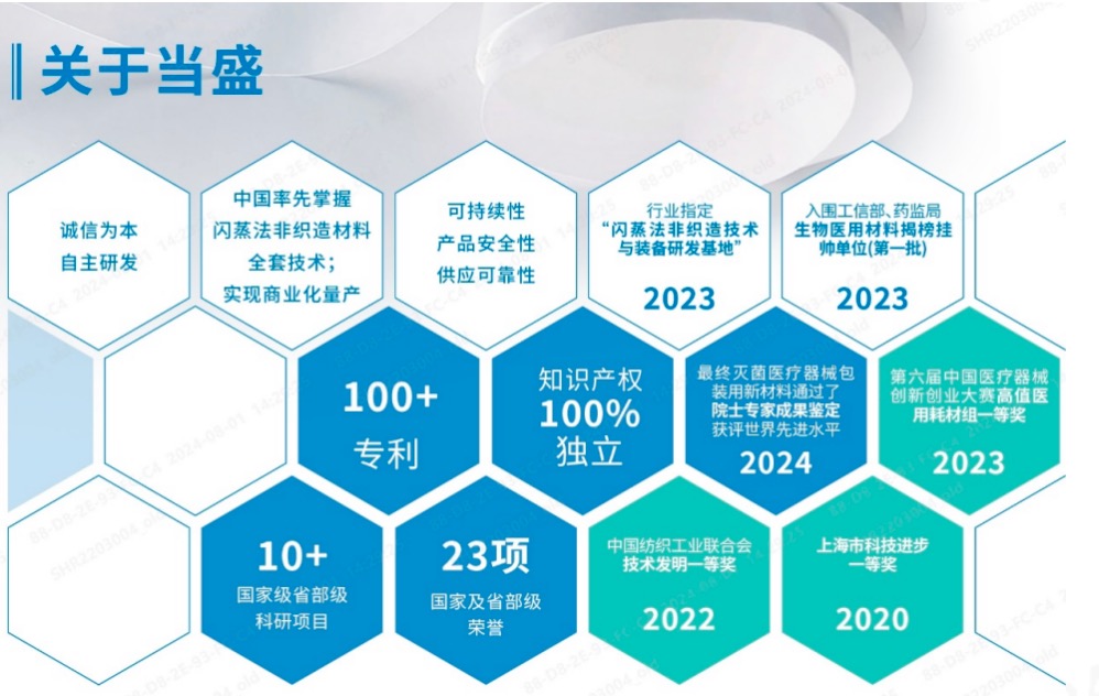 当盛®Dawnsens®材料是由100%高密度聚乙烯(HDPE)通过闪蒸法工艺制成的超细纤维(直径范围0.1至10微米),经过热压处理形成致密且具有三维立体网状结构的屏障材料,独立的医疗专用生产线(十万级洁净车间),专门设计用于最终灭菌医疗包装以及制药行业的无菌转运包装。