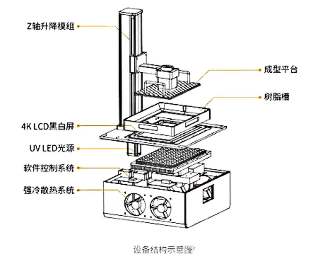 LCD打印机:UV光来自LCD的LED发光阵列。屏幕充当蒙版,仅显示当前图层所需的像素。来自LCD面板的光线以平行模式直接照射在构建区域上,打印质量由LCD密度决定。像素数越高,打印质量越好。