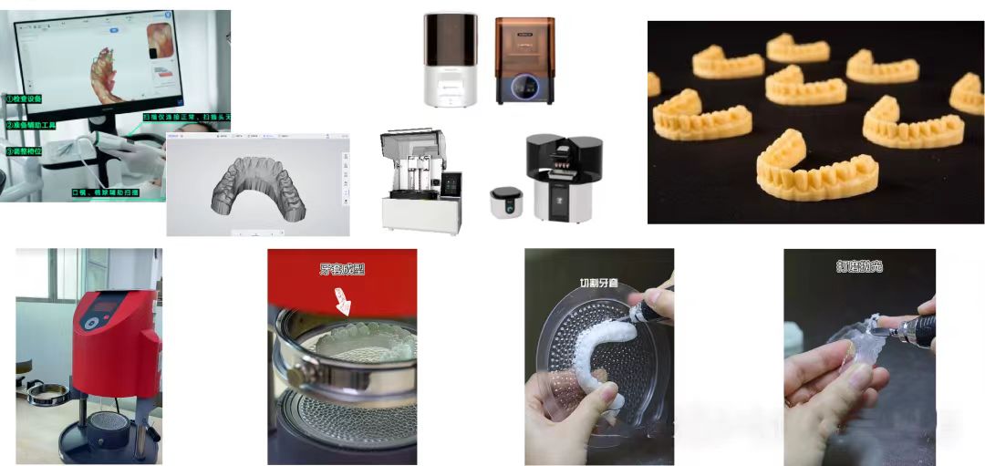 目前3D打印已被用于制作牙颌正畸模型、个性化正畸装置(如唇侧托槽和舌侧托槽、无托槽隐形矫治器、透明保持器) 、微型种植体手术导板、间接粘接托盘、下颌前移夹板、咬合板等。
