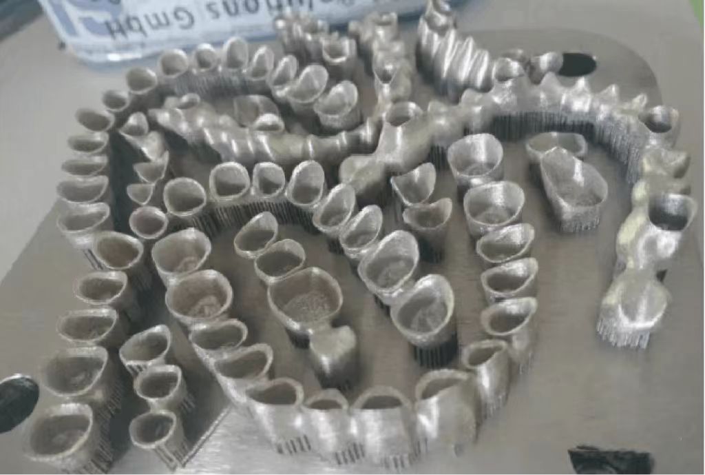 SLM以高分子粉末、陶瓷粉末、金属粉末等为材料,激光束按一定路径照射工作台上的粉末,使其完全融化继而凝固,完成后平台下降,重复铺粉和烧结直至打印完成。SLM加工的金属致密度高,力学性能良好,但制作的产品表面质量不高,需要大量后处理,且成型过程中热应力、组织应力、残余应力的产生易导致制件翘曲变形或出现裂纹。