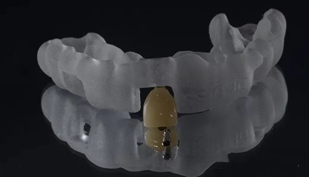 具体来说,该指南可帮助牙医将种植牙正确放置在正确的位置。它是一种一次性设备,设计用于直接放置在患者的牙齿上,并具有一个孔,可以将种植体以正确的角度和深度放置在正确的位置。这种方法的精度更高,大约是手工放置的三倍。