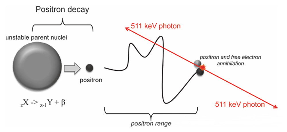 释放的正电子在体内迅速与周围的电子相遇。当正电子与电子(两者具有相等的质量但相反的电荷)相遇时,它们会相互湮灭,这个过程遵循能量守恒和动量守恒定律。湮灭过程产生两个能量为511keV的伽马射线光子,这两个光子以180度角反向发射(近似)。