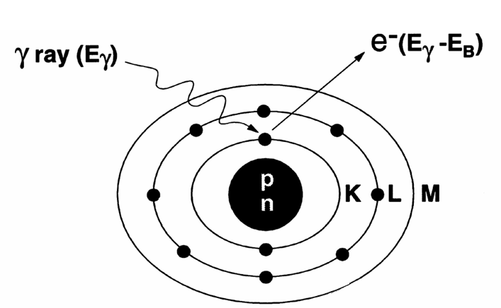 光电效应(表示为”τ”):γ射线光子将其全部能量转移给内层电子,导致电子被释放。