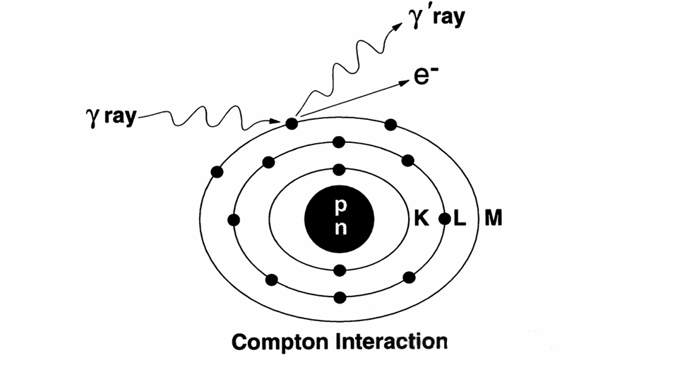 康普顿散射(表示为”σ”):γ射线光子与电子相互作用,部分能量转移给电子,光子改变方向并损失能量,电子被弹射出来。
