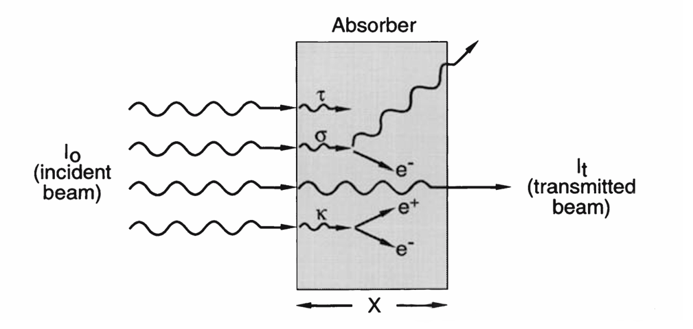 γ射线在穿过吸收介质时,会经历上述三种过程之一或它们的组合(光电效应、康普顿散射和电子对对效应),这取决于它们的能量;或者它们在不发生任何相互作用的情况下穿过吸收体: