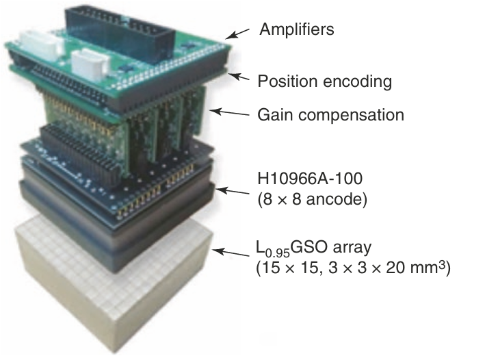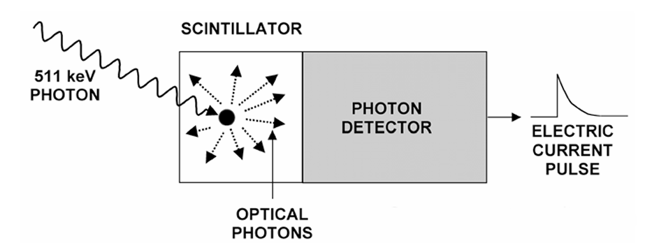 闪烁探测器是广泛使用的伽马射线探测器,构成了当今几乎所有PET扫描仪的基础。这些探测器由密集的晶体闪烁材料组成,作为伽马射线和高能光子的相互作用介质,当能量在其内部沉积时会发出可见光。然后这种光被某种形式的可见光光子探测器检测,并转换为电流: