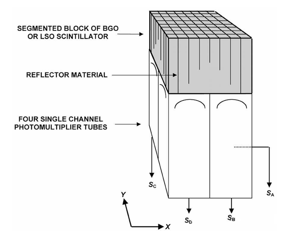 展示了一个典型的PET探测器块(block detector)的示意图。上方为晶体,下方为光电倍增管: