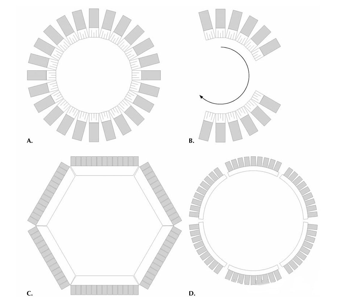 一个完整的PET系统由大量探测器组成,通常采用环形几何结构围绕被成像物体布置。探测器可以是小块探测器或大面积位置敏感探测器,后者可能以多边形排列: