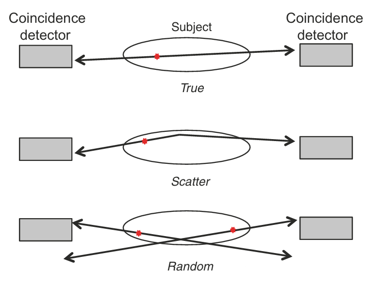 具有完美能量分辨率和时间分辨率的探测器理论上能够识别所有真实的符合事件,并排除任何散射或随机事件。然而,由于探测器的有限分辨率,在实践中这是不可能完全做到的。