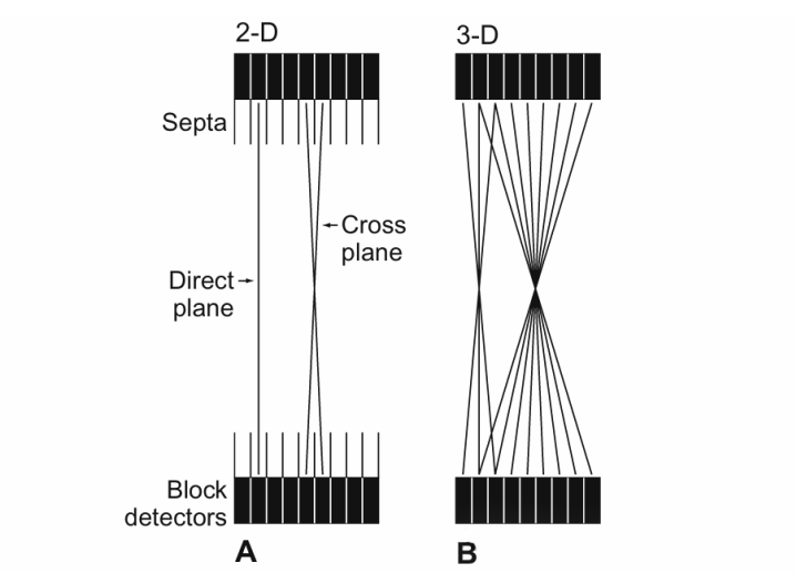 (A) 在环之间放置隔板进行二维(2D)数据采集,以获得避免随机和散射干扰的真实符合计数。连接在同一环中的探测器提供直接平面事件。然而,如图示,相邻环中的探测器连接后,可以获得交叉平面数据。