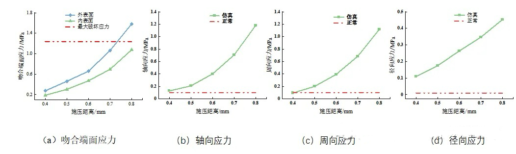 在正常血压状态下,血管主要受到轴向、周向和径向的应力,其中轴向和周向应力的量级为0.1 MPa(拉力),径向应力量级为0.01 MPa(压力)。因此,吻合器对血管组织在3个方向上施加的应力应大于正常情况,才能达到良好的吻合。本文结果显示,在不同施压距离下,吻合端面在轴向和径向应力均大于生理状态下的拉(压)力[见图2(b)、(d)],而当施压距离为0.4 mm时,其周向应力小于生理状态下的压力,不满足良好吻合的条件[见图2(c)]。