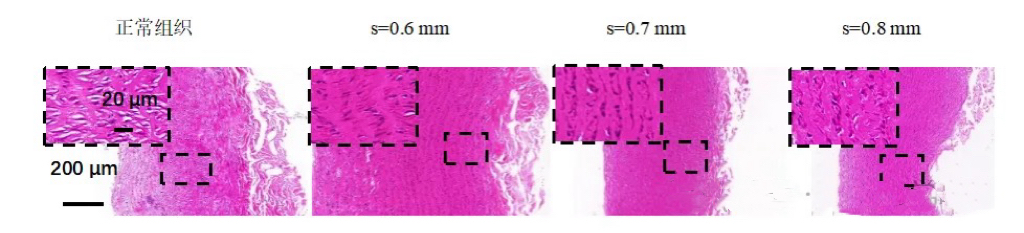 观察吻合后的组织微观结构,正常组织的弹性纤维和和胶原纤维呈现出网状结构,外膜为疏松的结缔组织。而组织受到挤压后,内部结构变得紧密。当施压距离为0.6、0.7 mm时,组织的平滑肌细胞排列有序。当施压距离为0.8 mm时,由于组织受到过度的挤压,导致细胞排列发生紊乱(见图4)。