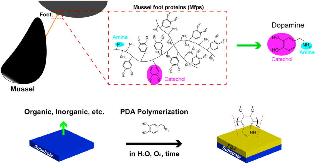 图 1. 多巴胺受贻贝启发的化学示意图,用作合成和沉积保形聚多巴胺 (PDA) 薄膜的前体材料。