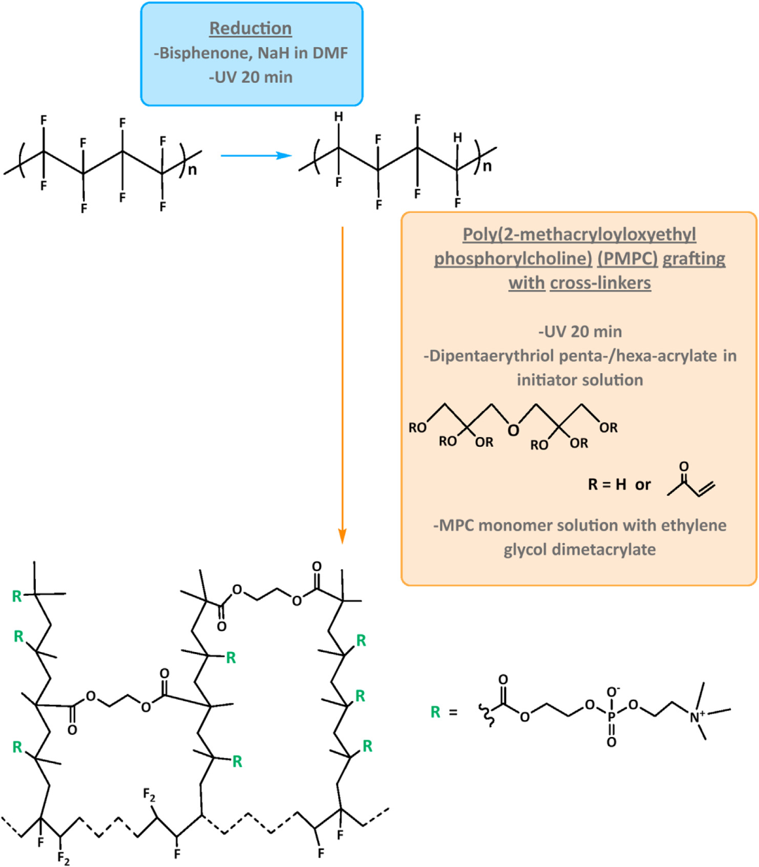 根据建议的工艺,用于化学还原材料表面的另一种可能性是对表面进行化学处理,如图 2 所示,其中 C-F 键部分还原为 C-H。这已被应用于改善抗菌和抗炎特性,这对 ePTFE 植入物可能涉及的问题很有意义。建议的工艺是如图 2 所示的表面化学处理,其中 C-F 键部分还原为 C-H 键。化学路线是在紫外光下用DMF中的双苯酮/NaH处理ePTFE。然后,2-甲基丙烯酰氧乙基磷酰胆碱 (PMPC) 在紫外光下接枝并聚合到还原表面。已对改性表面材料进行了体外和体内测试,以评估细菌粘附和炎症反应。在体外测试了牛血浆纤维蛋白原的蛋白质粘附、成纤维细胞 (NIH3T3) 的粘附和活化以及金黄色葡萄球菌的细菌粘附,发现与未修饰的 ePTFE 相比,PMPC 接枝的 ePTFE 显着降低。定量荧光强度结果表明,与未修饰的相比,官能化板的金黄色葡萄球菌的粘附和生长减少了 60%。在 ePTFE 上使用相同的分子与 Ar 等离子体处理相结合,以获得血小板抗粘附特性。