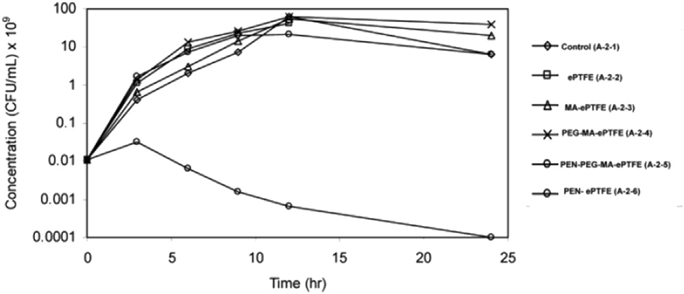 图 3. 金黄色葡萄球菌的浓度作为实验序列时间的函数绘制:对照、ePTFE、MA-ePTFE、PEG-MA-ePTFE、PEN-PEG-MA-ePTFE 和 PEN-ePTFE。