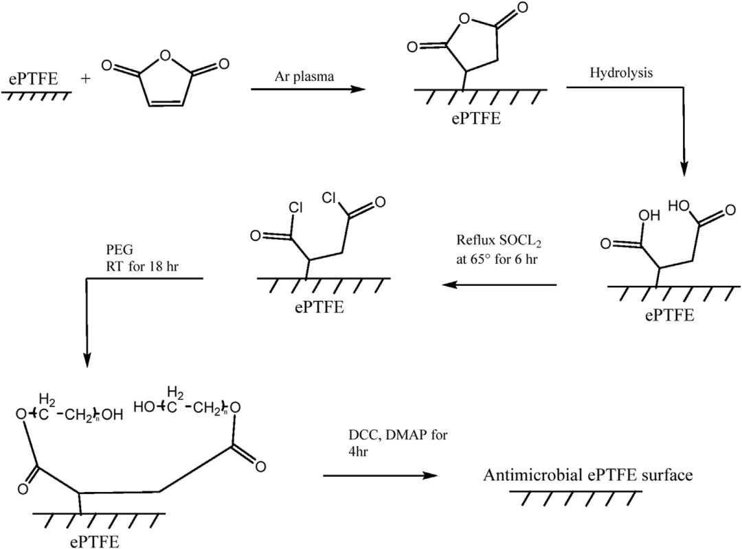 图 2. 从 ePTFE 表面活化到接枝的化学路线。