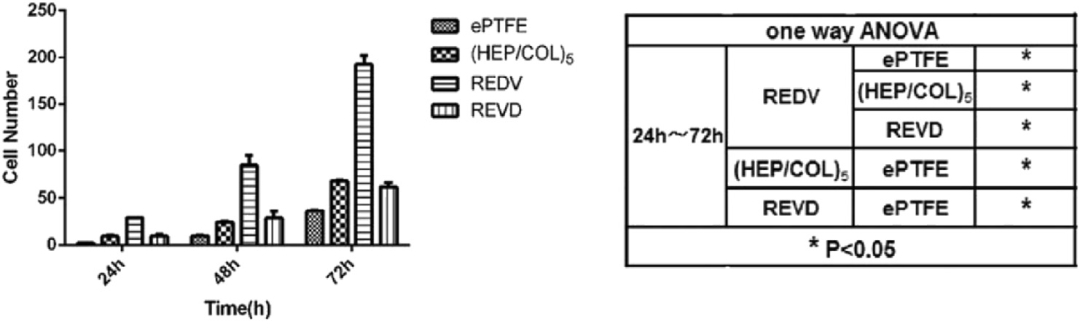 诸如等离子体之类的激进“启动”允许进一步修改以实现逐层 (LbL) 组装到 PTFE。LbL 技术主要设计用于医疗应用,以改善细胞粘附。例如,我们在这里介绍一种使用肝素和胶原蛋白多层膜来改善 ePTFE 移植物的再内皮化和抗凝的方法。LbL 处理后还添加了内皮细胞 (EC) 粘附肽序列 Arg-Glu-AspVal(REDV),以促进细胞粘附在表面上。体外血浆再钙化时间法显示 REDV-LBL-ePTFE 的血浆凝固时间比纯的更长。在共培养 72 小时后,REDV 涂层和改性的 ePTFE 表现出 95% 的表面被静脉内皮细胞定植,而单独的 ePTFE 表现出的贴壁细胞少八倍,而 LBL-ePTFE 则四倍。不同版本的 ePTFE 上附着的细胞数量的定量结果如图 5 所示。