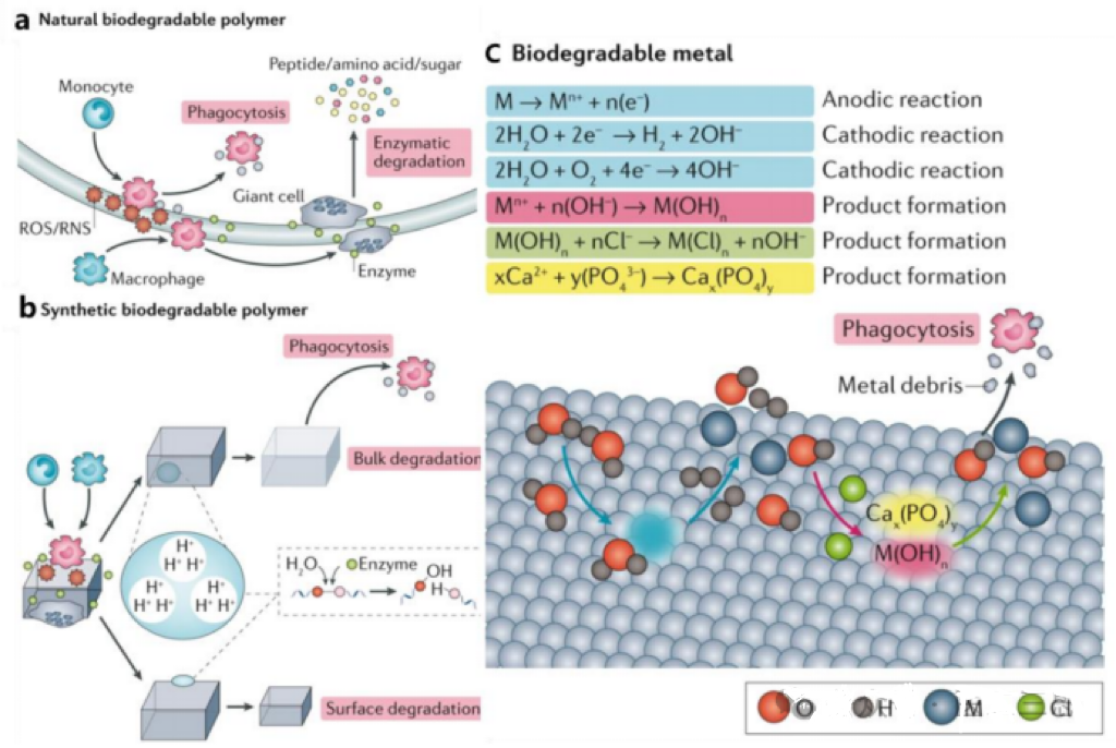 图1生物可降解材料降解机理示意图 a:天然可吸收高分子通过细胞外(酶促、氧化)和细胞内降解(吞噬作用)降解;(b)合成聚合物的降解发生在体内通过水解,酶降解和氧化;(c)金属通过电化学反应生成氧化物、氢氧化物、氢气和磷酸钙沉淀