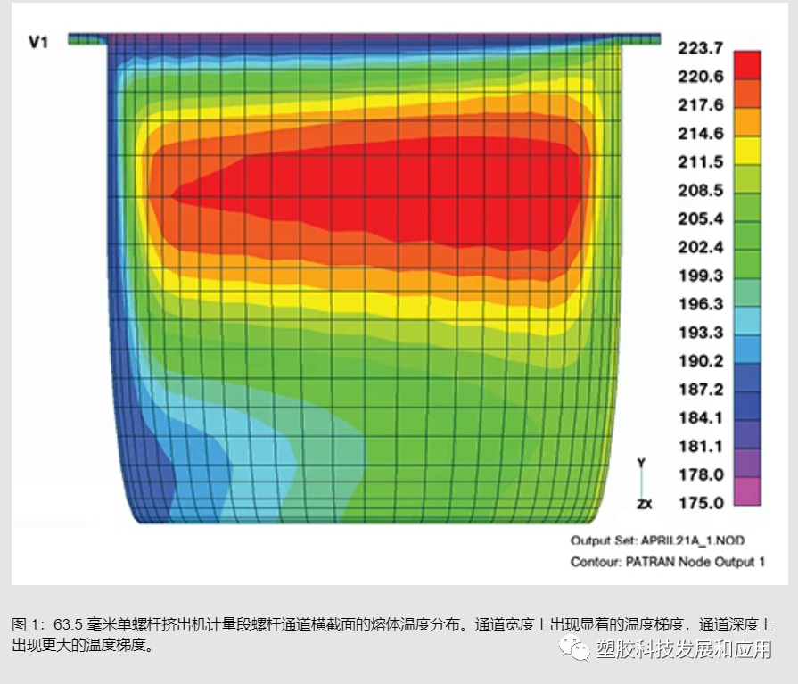 稳态熔体温度可以使用有限元分析来计算。图1显示了计量部分螺杆通道横截面的熔体温度分布。该图显示,通道的宽度和深度上可能会发生显著的温度变化。最大的温度梯度出现在整个通道的深度。