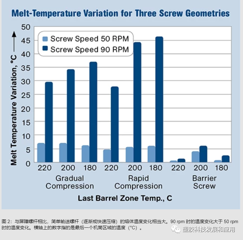 研究发现,随着时间的推移,熔体温度会发生显著变化,5 至 10 秒内熔体温度高达 45°C。图 2 显示了三种螺杆几何形状、三种机筒温度曲线和两种螺杆速度下的熔体温度变化。有趣的是,简单的输送螺杆的熔体温度变化相当大。螺杆转速为 90 rpm 时的变化大于 50 rpm 时的变化 — 这对于所有三个螺杆都是如此。简单输送螺杆在 90 rpm 转速下的熔体温度变化大约比屏障螺杆高一个数量级。