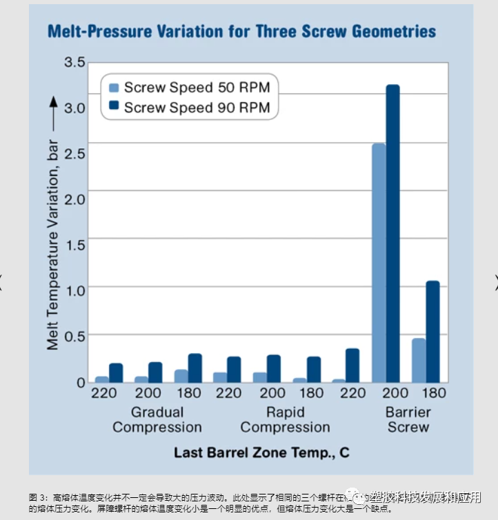 高熔体温度变化并不一定会导致大的压力波动。这如图 3 所示,其中显示了相同螺杆速度和机筒温度曲线下相同三个螺杆的熔体压力变化。