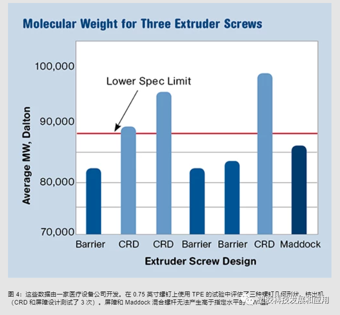 在医疗器械的挤出过程中,分子降解通常是一个关键问题。分子量 (MW) 的降低会受到挤出机螺杆几何形状的强烈影响。螺杆几何形状对 MW 的影响如图 4 所示。在本研究中,螺杆几何形状对 MW 的影响如图 4 所示。挤出机与热塑性弹性体 (TPE) 一起使用。测试了三种螺杆几何形状:屏障螺杆、CRD 混合螺杆和 Maddock 混合螺杆。这些数据是由一家大型医疗设备公司在开发植入设备时生成的。MW 结果至关重要,因为该聚合物用于植入式 CRM 导联线绝缘材料,容易在体内发生水解和金属离子降解。
