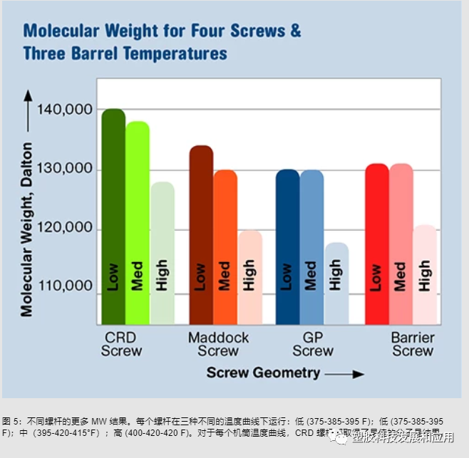图 5 显示了不同挤出机螺杆的更多 MW 结果。每个螺杆在三种不同的温度曲线下运行。“低”表示机筒温度为 375-385-395 F。“中”表示机筒温度为 395-420-415 F。“高”表示机筒温度为 400-420-420 F。对于 CRD 螺杆达到的每个温度分布最好的分子量结果。Maddock 螺杆、通用螺杆和屏障螺杆的分子量结果没有显著差异。
