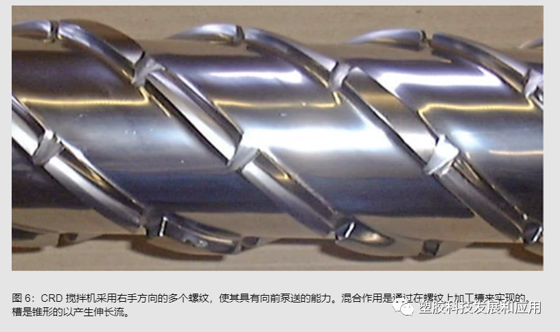 CRD 螺杆的混合部分采用多螺纹,右旋方向。因此,该混合器具有正向泵送能力。混合作用是通过在螺纹上加工槽来实现的。槽是锥形的以在槽中产生伸长流。