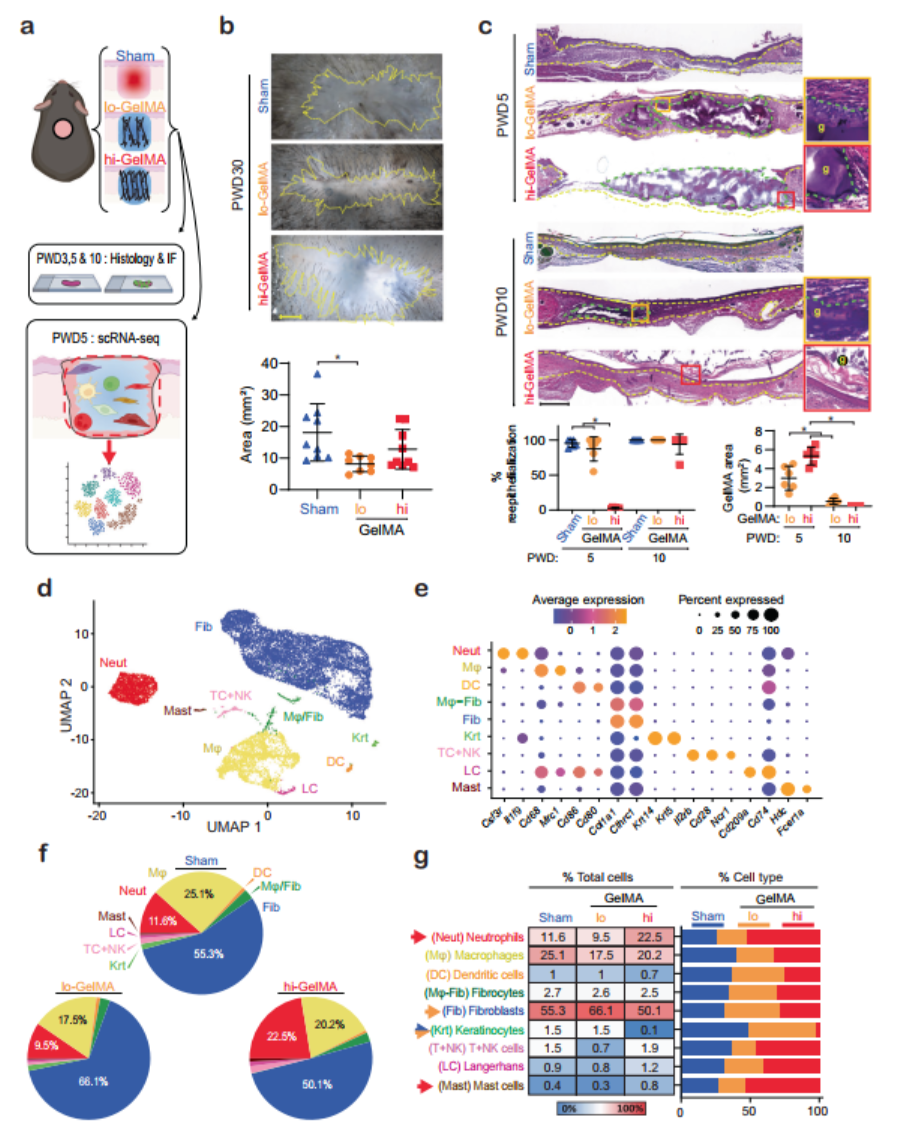 为评估GelMA交联对疤痕和伤口结构的影响,本文将GelMA应用于5毫米全层背部皮肤伤口。使用365纳米光照1分钟创建轻度交联的水凝胶(lo-GelMA),使用5分钟光照创建重度交联的水凝胶(hi-GelMA)。所有伤口用Tegaderm覆盖,对照伤口(Sham)未处理,仅用Tegaderm覆盖(图1a)。在伤后第5、10和30天收集伤口组织进行组织学检查。在PWD30时,与Sham相比,lo-和hi-GelMA都倾向于产生更小的疤痕尺寸;然而,lo-GelMA在疤痕面积上显示出显著减少(图1b)。在PWD5和10时对伤口进行H&E染色显示,在PWD5时,lo-GelMA具有各种大小的细胞浸润通道,与真皮整合良好,随着纤维组织细胞、内皮细胞和其他免疫细胞从伤口边缘和深处浸润到支架中(图1c)。相比之下,hi-GelMA显示出最小的细胞浸润和由于更强的异物反应(FBR)引起的生物材料排出的开始。此外,在PWD5时,lo-GelMA上的再上皮化覆盖了60-100%的伤口,而hi-GelMA仅覆盖了2-5%(图1c),这与之前关于多孔支架的研究一致。在hi-GelMA外围的聚集体表明生物相容性差,可能是由于不利的hi-GelMA-周围伤口相互作用。lo-GelMA的横截面积范围为1–5 mm²,而hi-GelMA的测量值为4–7 mm²(图1c),表明lo-GelMA降解更多。到了PWD10,lo-GelMA的横截面积为0–1 mm²,而hi-GelMA仍未结合,导致在凝胶下再上皮化并最终排出。总的来说,lo-和hi-GelMA的反应在生物相容性和细胞整合方面似乎有所不同,因此本文假设水凝胶及其交联程度通过调节免疫和基质细胞来调控疤痕形成。