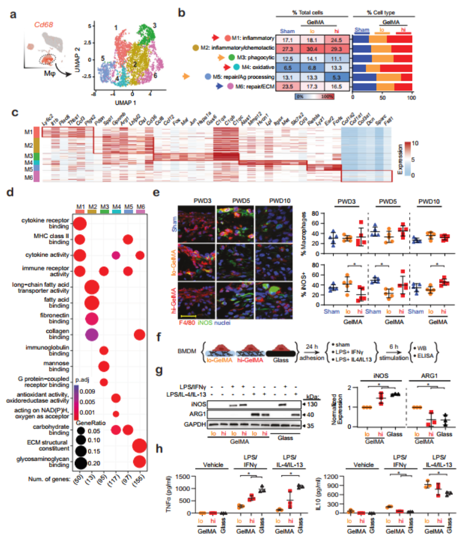为探索交联效应对巨噬细胞(Mϕ)免疫调节的影响,本文通过将Cd68high/Mrc1high群体细分为六个功能亚群(M1-6),基于与规范标志物相比的差异基因签名(图2a)和基因本体论(GO)表征(图2b-d)进行了分析。比较hi-和lo-GelMA,亚群M1和M4在hi-GelMA中上调,而M5和部分M3在lo-GelMA中上调。M2和M6在很大程度上不受GelMA交联的影响,但在两种GelMA条件下与Sham相比,M6都有所减少。