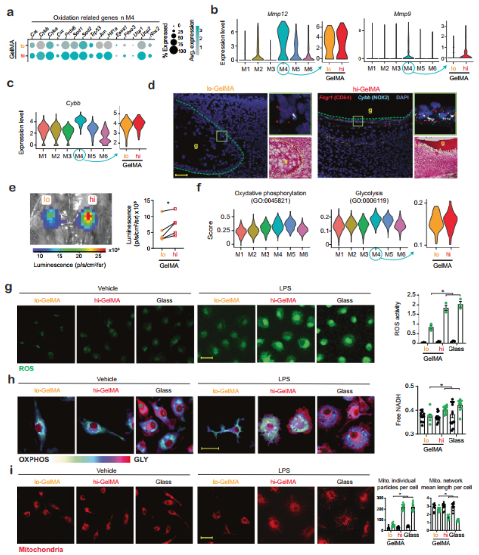 M4相关的基因和GO术语显示了促炎、分解代谢和氧化活性,这个集群在hi-GelMA中比lo-GelMA更为显著(图2b,d)。在这个群体中,本文观察到与氧化应激相关的M4表达基因——Cat、Cybb、Sod1、Hif1a和Ucp2——在hi-GelMA中比lo-GelMA更为突出(图3a)。升高的氧化可能导致持续的组织损伤和炎症解决的延迟,从而导致瘢痕增加。此外,M4 Mϕs表现出高表达关键的ECM蛋白酶,Mmp12和Mmp9,这也在hi-GelMA中比lo-GelMA更高(图3b)。本文假设这些Mϕs直接响应hi-GelMA并显著促进了增加的炎症和纤维化。