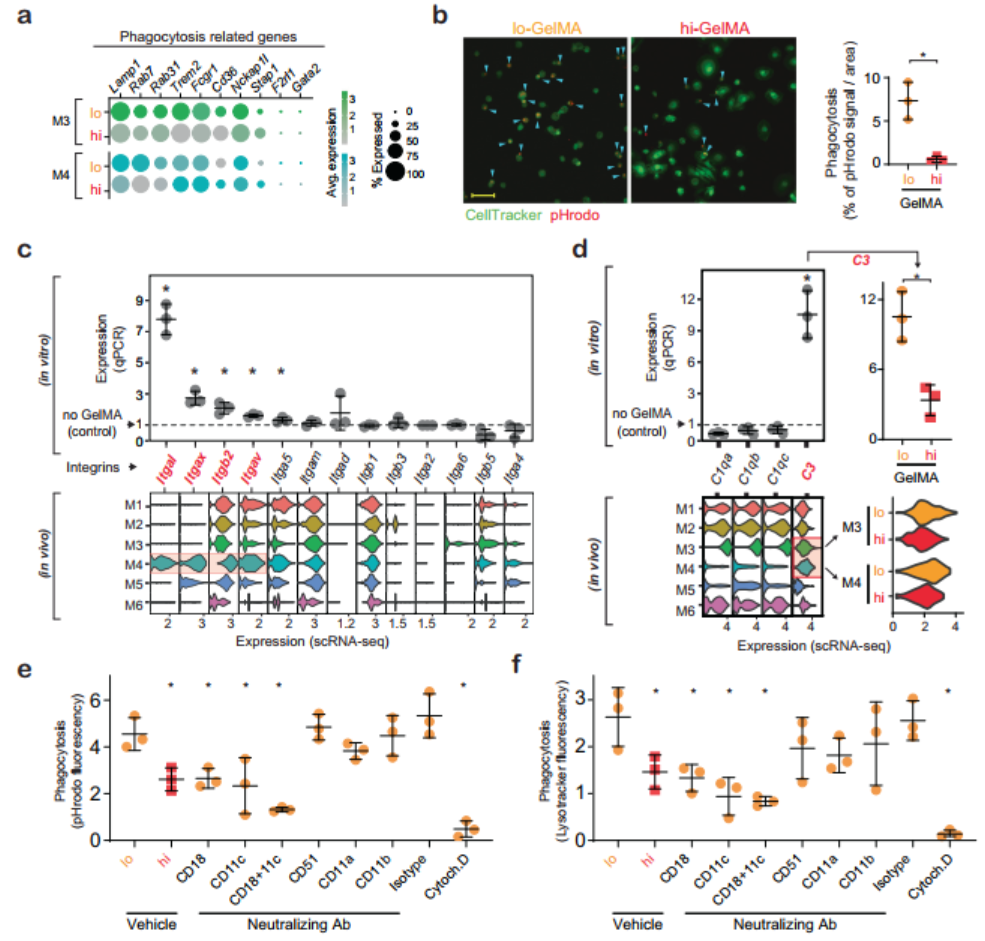 虽然M4显示出分解代谢活性,但GO分析显示,在lo-GelMA中富集的M3表现出吞噬活性(图2b-d)。在M3中,以及在较小程度上在M4中,与吞噬活性相关的基因(Lamp1、Rab7、Rab31、Trem2)在lo-GelMA中比在hi-GelMA中更为突出(图4a)。为了比较hi-和lo-GelMA的巨噬细胞吞噬作用,将标记的BMDM(CellTracker,绿色)接种在用pH敏感染料(pHrodo,红色)标记的水凝胶上。12小时后,BMDM显示出对lo-GelMA相比hi-GelMA有显著更高的吞噬作用(图4b)。为探索整合素如何影响Mϕ-GelMA相互作用,本文探究了与粘附和吞噬相关的整合素的表达谱。结果表明:与其他亚群相比,Itgal、Itgax、Itgb2和Itgav在M4中上调更多(图4c)。在体外在GelMA上接种BMDM 24小时显示,Itgal、Itgax、Itgb2、Itgav的表达增加,一定程度上还有Itga5(图4c)。这些整合素在lo-和hi-GelMA上的表达水平相似,除了Itgav在lo-GelMA上更高。