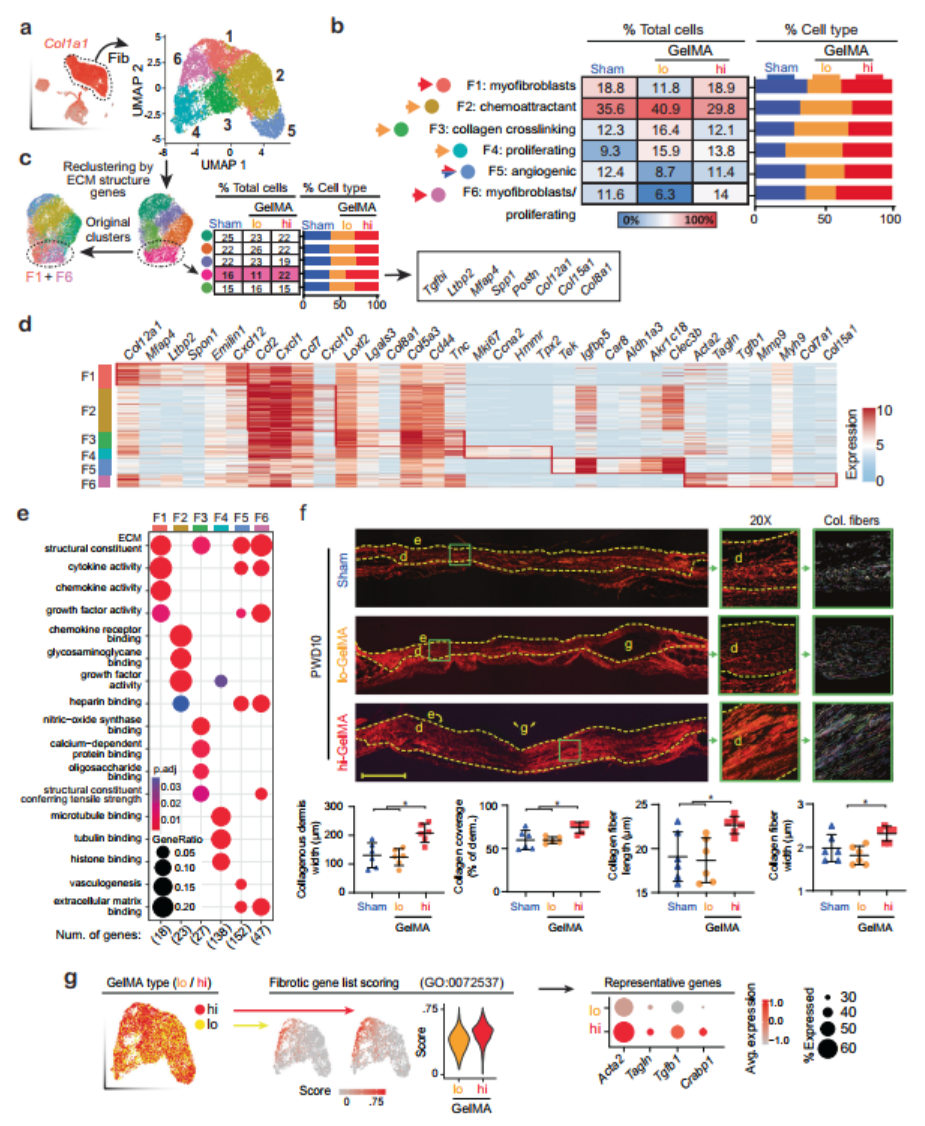 在hi-GelMA中,肌成纤维细胞集群(F1和F6)最为上调,表达了与收缩性伤口闭合和瘢痕形成相关的基因。F1平均占成纤维细胞的15.5%,在hi-GelMA(18.9%)和Sham(18.8%)中比lo-GelMA(11.8%)更为普遍。这个集群表达了Col12a1和Cxcl12,在一定程度上还有Acta2和Tagln,以及涉及ECM产生、肌成纤维细胞分化和细胞因子/趋化因子活性的GO通路(图5d, e)。F6还有更高的增殖标记物,包括Mki67和G2/M期基因。总的来说,F1和F6在hi-GelMA中占成纤维细胞的33%,在Sham中占31%,在lo-GelMA中占18%。最后,F5在hi-GelMA(11.4%)和Sham(12.4%)中比lo-GelMA(8.7%)更丰富。