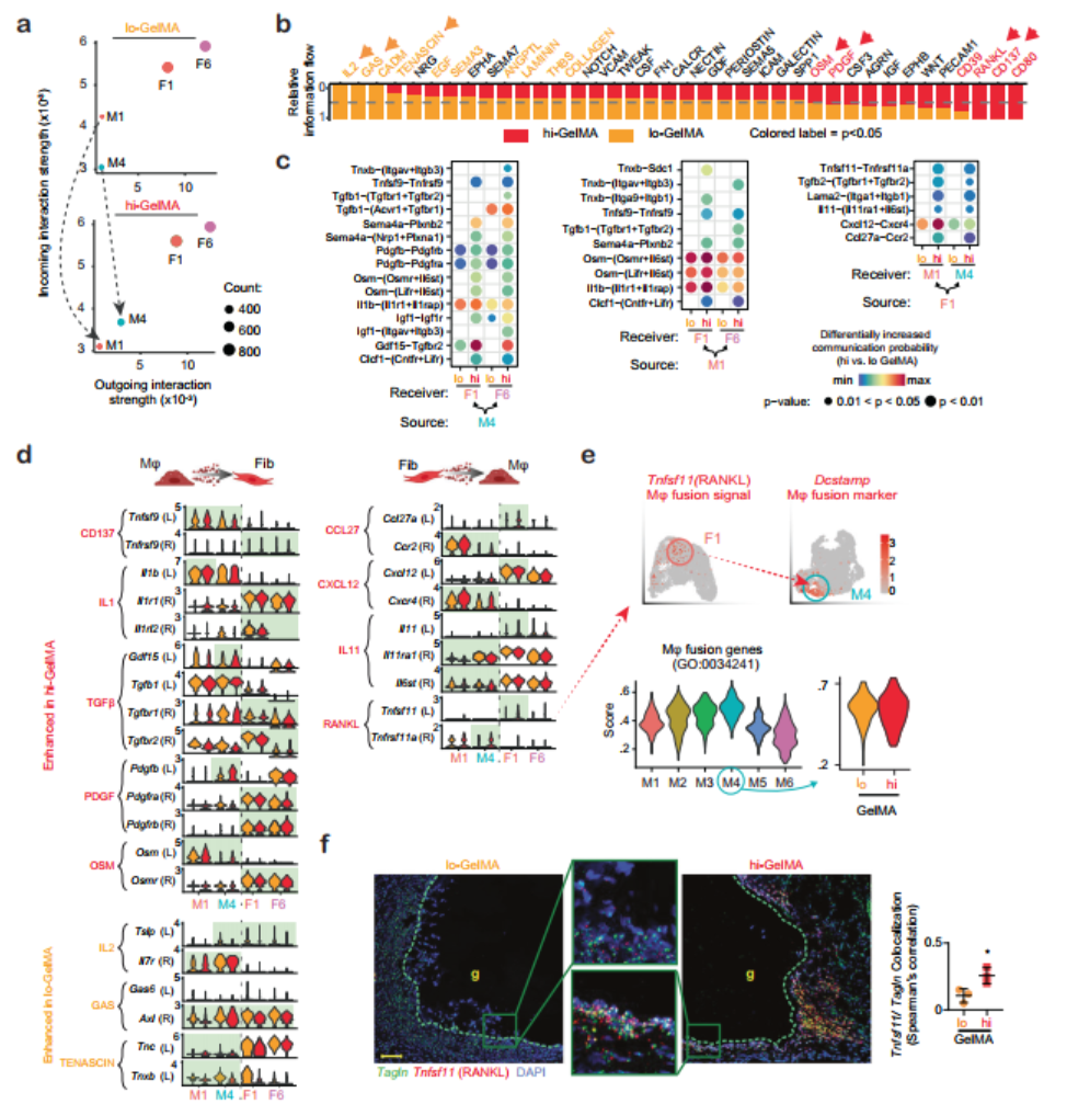 随着GelMA交联程度的增加,导致更多的炎症性Mϕs和纤维化成纤维细胞的出现,本文探究了在hi-与lo-GelMA处理的伤口中它们的相互作用。免疫荧光染色在第5天创伤后显示,Mϕs和成纤维细胞在整个伤口中紧密相邻。CellChat分析的配体-受体对揭示了来自M4的高度外向和内向信号,以及与lo-GelMA相比,hi-GelMA中M1的内向信号减少(图6a)。信息流分析,追踪细胞对之间的通信概率,显示hi-GelMA显著上调了促纤维化的血小板衍生生长因子(PDGF)、肿瘤抑制素M(OSM)和核因子kappa-Β配体活化受体(RANKL)通道(图6b)。相反,lo-GelMA主要特征为IL2、GAS和TENASCIN通道,这些通道参与了Mϕ表型调节。